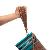 This stunning tooling leather Wristlet is designed to be interchangeable with your favourite cowhide clutch. This wristlet features hand tooling leather on the outside with buck stitching and plain leather on the inside, finished off with brass hardware.