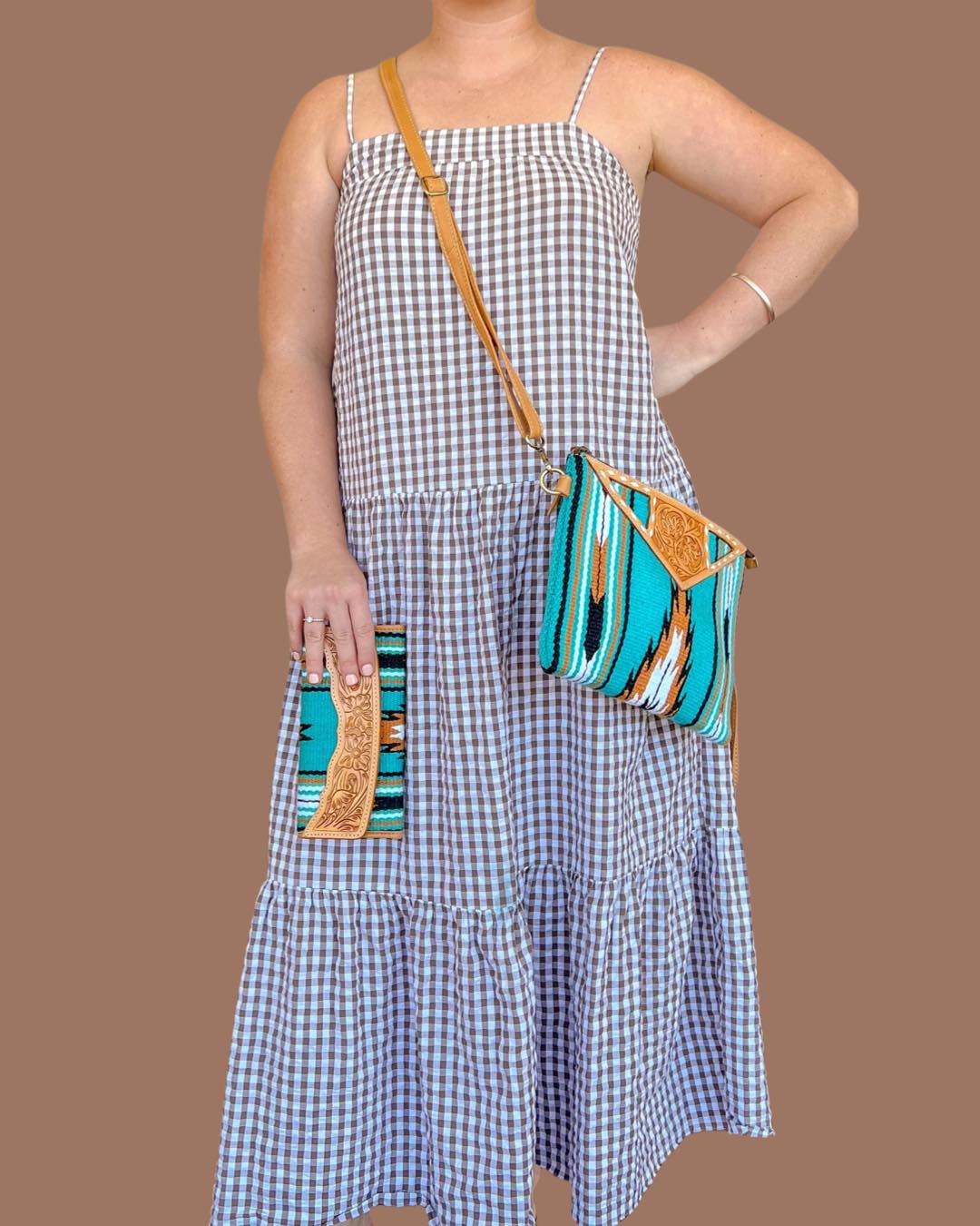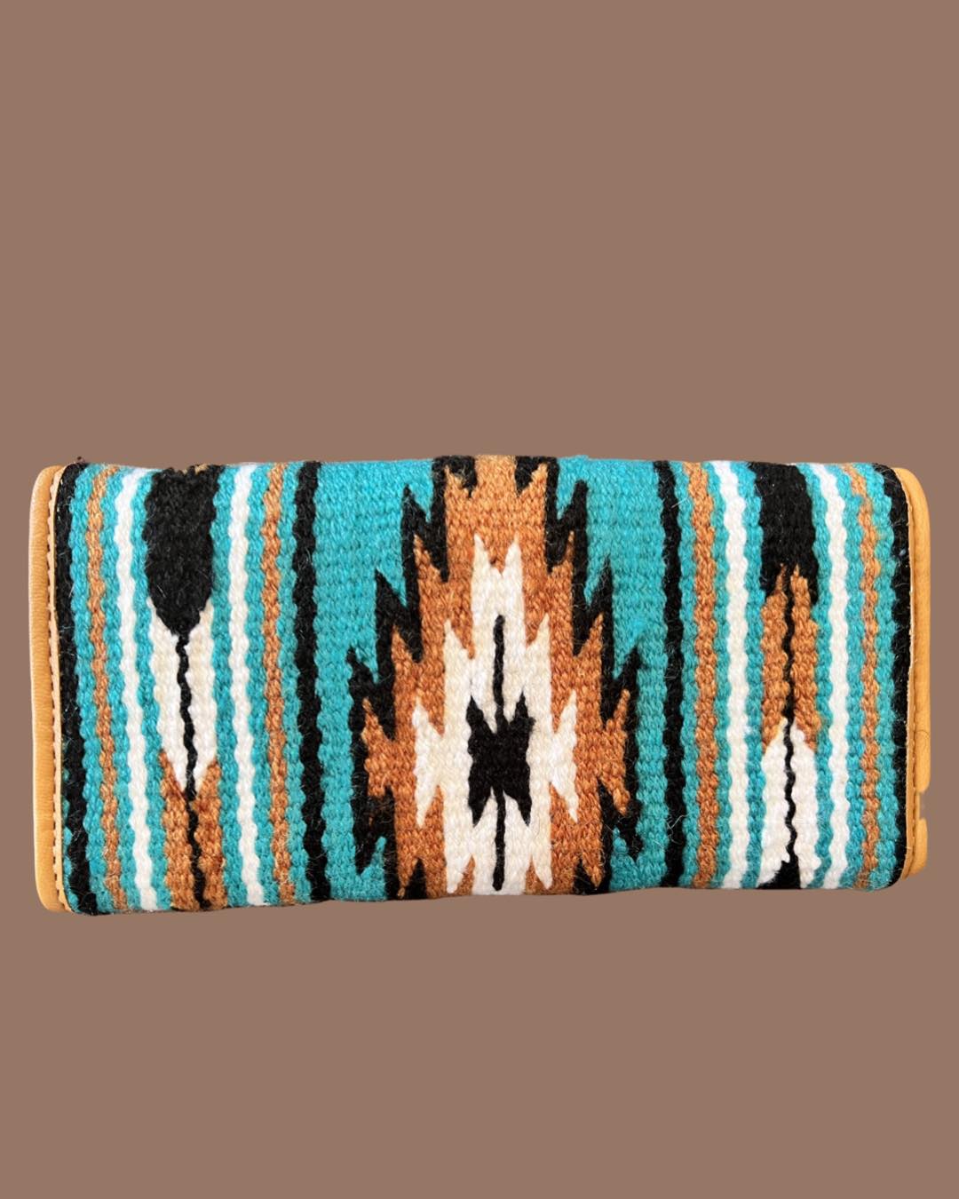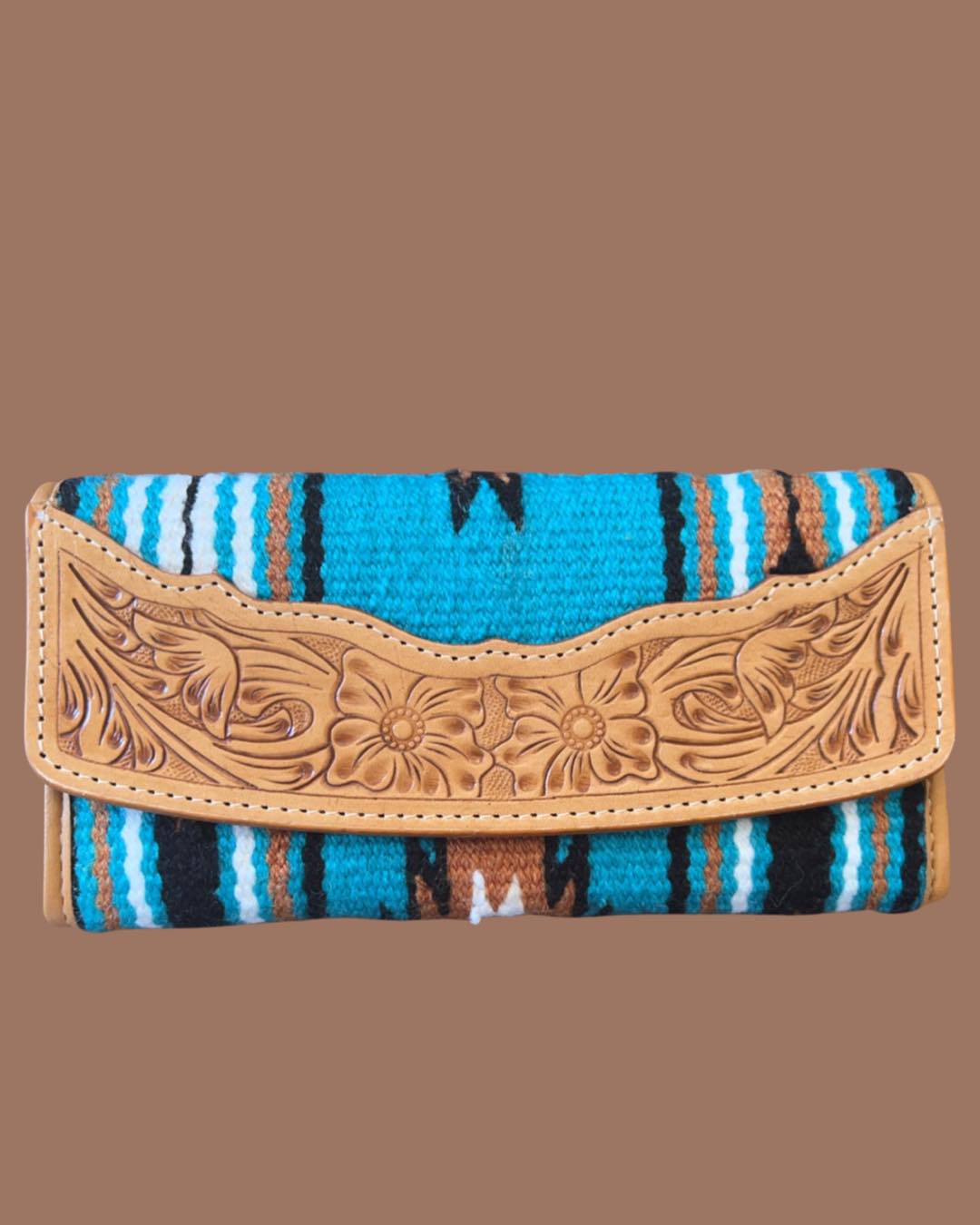 This must have saddle bag wallet with intricate hand tooled details along with 100% Hand Woven Saddle Blanket Fabric on the front panel. Perfect match for our Teal & Tan saddle bag with tooled leather.