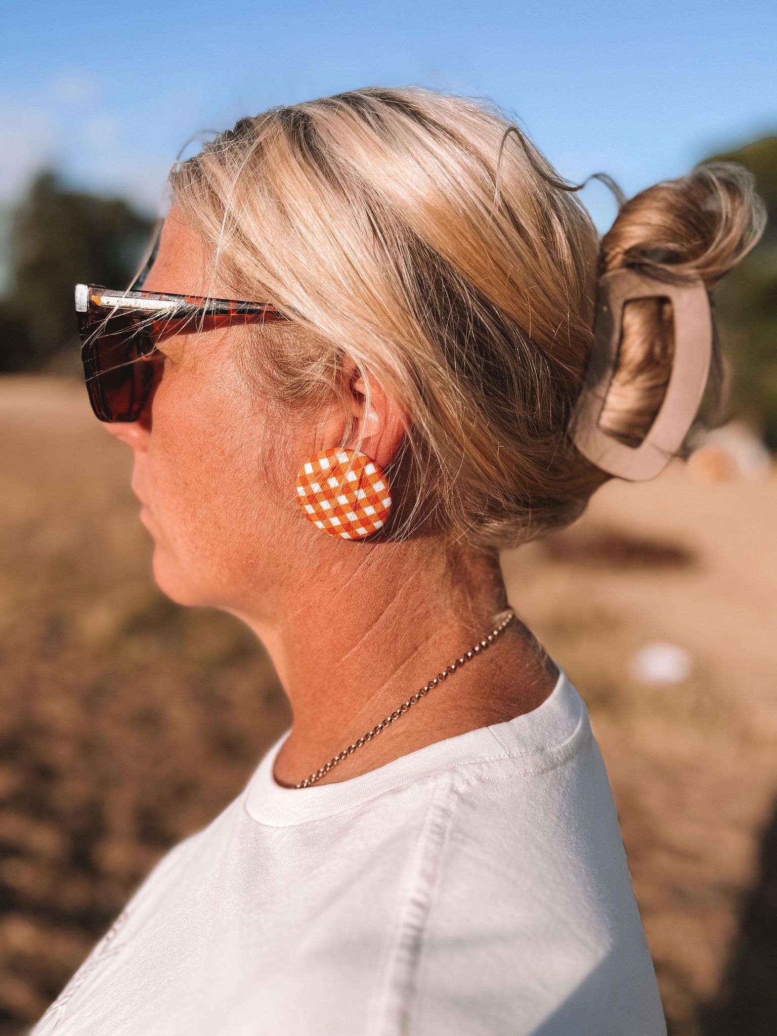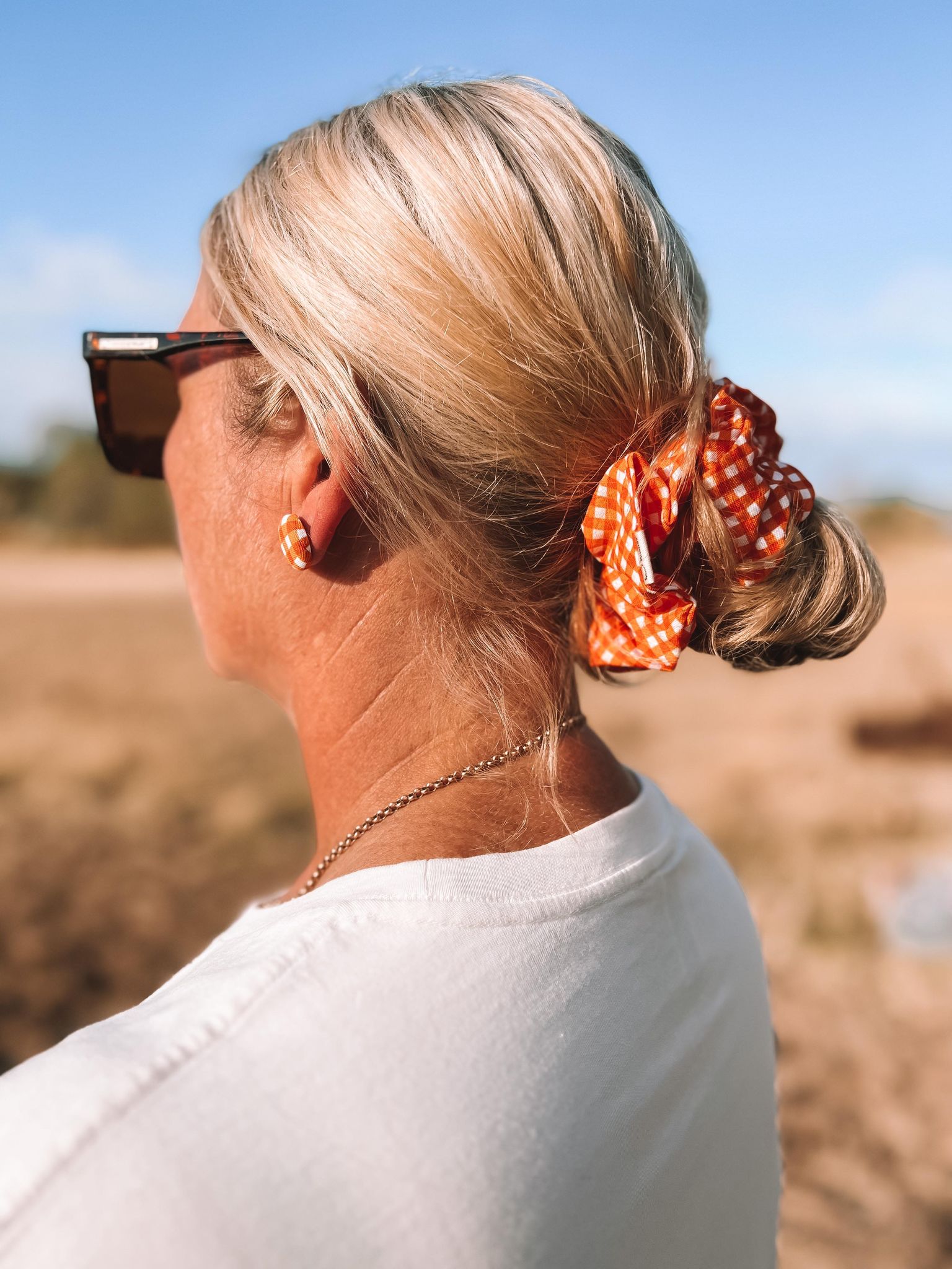 Orange gingham scrunchies compliments any outfit, plus they beautifully match with the Cordlia Earrings!