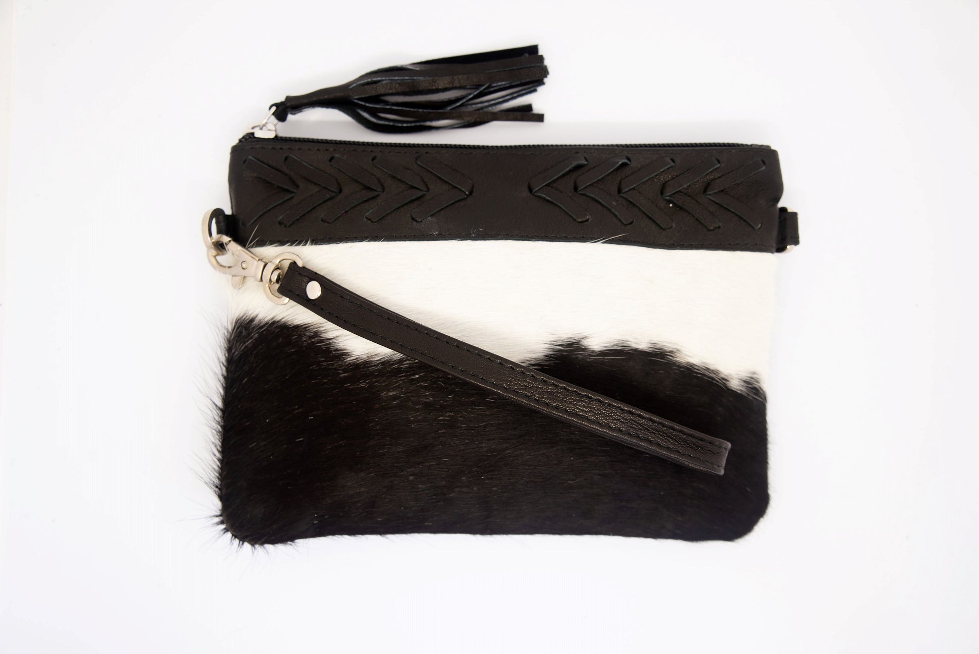 Stunning cowhide leather bag featuring natural black and white cowhide to front panel with leather handwork detailing.